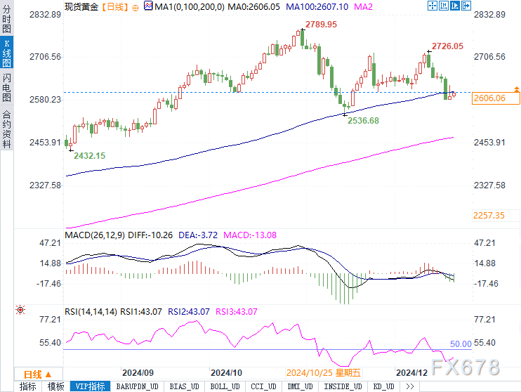 根据技术分析,黄金价格的下行支撑位位于2,583美元附近,这一位置自12月19日以来已显现出一定的支撑作用。若金价突破这一支撑位,则可能会进一步回调至2,560美元区间,甚至测试2,537-2,536美元的区域。若金价进一步下跌并突破这些支撑位,2,500美元关口将成为下一个心理支撑区。