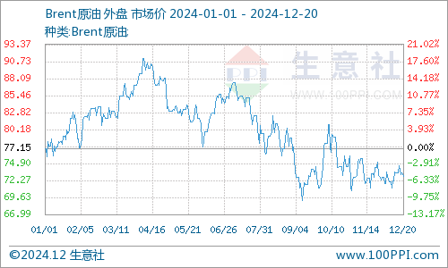 2024年在地缘、宏观与供需基本面的影响下,国际原油走出冲高回落、逐渐震荡收窄的行情,油价逐渐回归基本面。截止到2024年12月19日,全年布伦特原油下跌了4.87%;WIT原油下跌了2.44%。