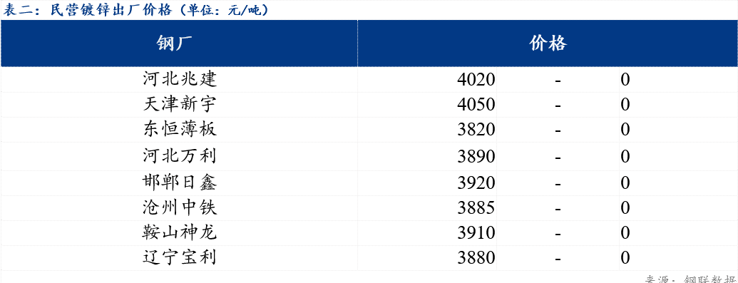 今日北方民营钢厂镀锌出厂指导价在3820元/吨-4050元/吨。