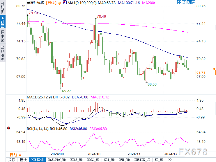 与此同时,美元的强势也加剧了油价下行的压力。美元指数近期攀升至两年新高,主要受到美联储鹰派立场的影响。美联储在其最新的货币政策声明中强调,预计在2025年将采取更加谨慎的降息步伐,这使得市场预期未来经济增长可能受到抑制,原油需求也可能因此受到拖累。美元的强势进一步加重了以美元计价的原油的价格压力,使得非美元地区的买家在购买原油时面临更高成本,从而减少了市场的购买动力。