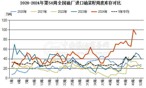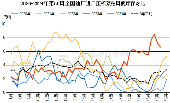 (3)国内油厂菜系库存下滑。粮油商务网监测数据显示,截止到2024年第50周末,国内进口油菜籽库存总量为91.2万吨,较上周的100.3万吨减少9.1万吨。国内进口压榨菜粕库存量为6.6万吨,较上周的7.3万吨减少0.7万吨,环比下降8.54%。