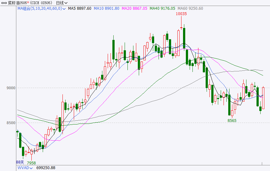 受加拿大菜籽产量及库存双双下滑、油脂进口下降的影响,今日国内菜油期货2505合约大幅上涨,截至收盘报9006元/吨,涨幅达到3.19%,涨278元/吨。