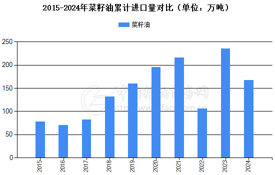 (3)数据统计显示,2024年1-11月菜籽油累计进口总量为167.00万吨,较上年同期累计进口总量的212.00万吨,减少45.00万吨,减少了21.23%。不过,菜籽油11月进口数据是环比略上升的。