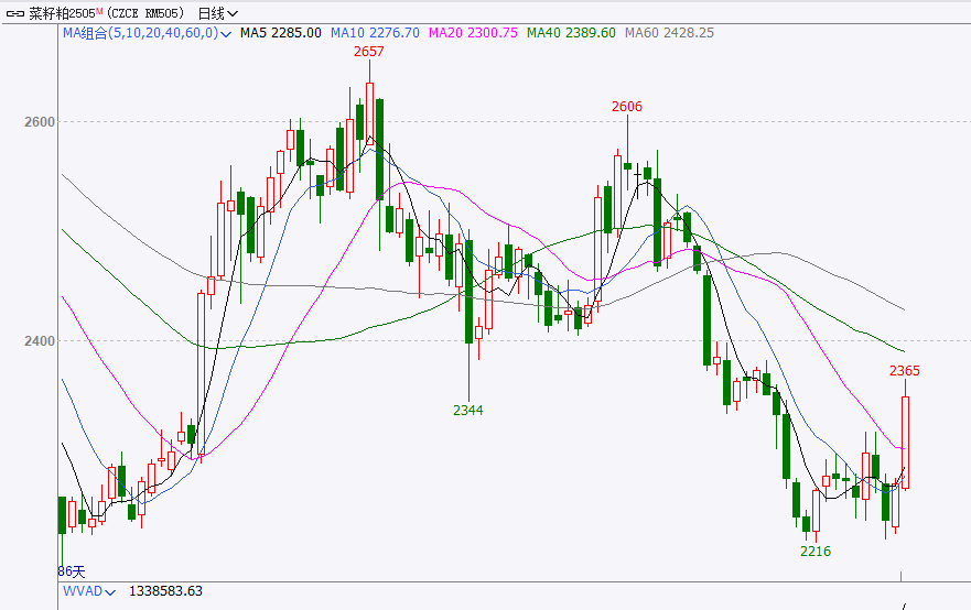 受加拿大菜籽产量及库存双双下滑的影响,今日国内菜粕期货2505合约大幅上涨,截至收盘报2349元/吨,涨幅达到4.35%,涨98元/吨。