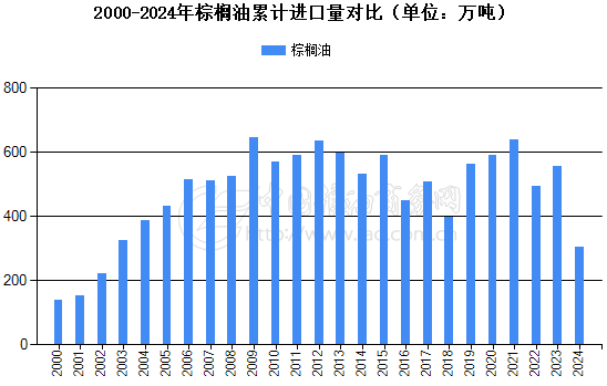 (4)棕榈油进口大幅减少,有利于菜油走强。海关数据显示,2024年11月棕榈油进口总量为17万吨,为本年度最低。11月棕榈油进口量,环比减少8万吨,同比减少39.1万吨,同比减辐69.7%。