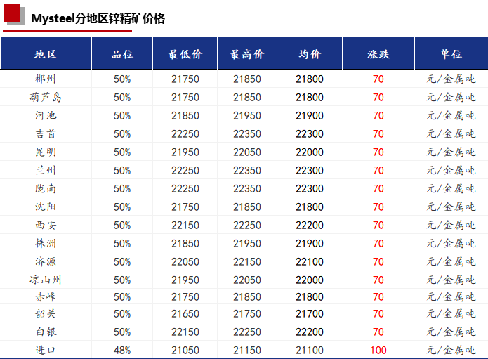 今日国内锌精矿加工费整体持稳,各地区均未调整。受锌价的影响,锌精矿价格上涨70元/金属吨。进口TC主流报价-45至-25美元/干吨,今日暂无调整。