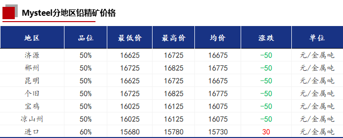 今日受铅锭价格影响,铅精矿价格受铅锭价格影响较上一交易日下跌50元/金属吨。铅精矿加工费各地区均未调整,较上一交易日持平。进口铅精矿价格较上一交易日涨30元/金属吨。