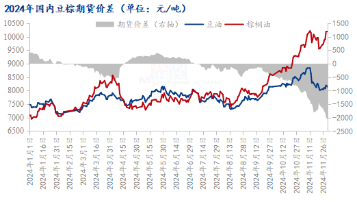 综上所述,国内棕榈油库存处于历史同期低位水平,11月船期陆续到港,然而豆棕期现价差倒挂幅度大幅走深,棕榈油走货维持刚需,月末商业库存环比下降4.49%。马来西亚11月份毛棕榈油的出口税为9.5%,较10月份提高1.5个税点,印尼11月毛棕榈油(CPO)参考价从10月的893.64美元/吨提高到961.97美元/吨,增幅7.6%。11月BMD马棕主连月线上涨328令吉/吨,涨幅6.99%,棕榈油进口成本延续前2个月上升趋势,进口利润持续倒挂,国内企业12月船期洗船数量较多。根据钢联数据的买船数据统计,2024年11月内棕榈油12月洗船5条、新增4条,净减少1条,根据历史数据计算12月买船仅13条,预计12月底国内棕榈油商业库存月环比减幅或有所扩大,库存供应偏紧。