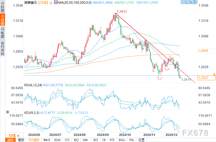 在日线图上,我们可以看到英镑/美元最终一路回落至11月低点1.2485附近。这是我们可以预期的买家介入的地方,风险低于1.28的水平。另一方面,卖方希望看到价格进一步下跌,增加对1.23支撑的看跌押注。