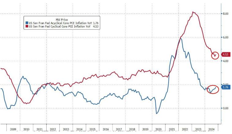 而且根据旧金山联储报告,周期性和非周期性通胀因素都在再次上升。旧金山联储主席戴利在周五公布这些数据之前表示,她对政策制定者明年两次降息的预期中值“非常满意”,并强调美联储可以采取更缓慢的方式。