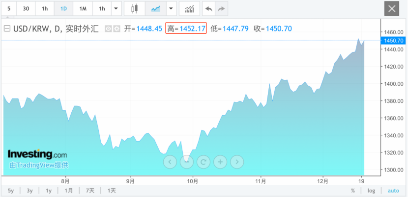 12月20日,韩元兑美元汇率一度失守1452,创下全球金融危机以来的最低值。