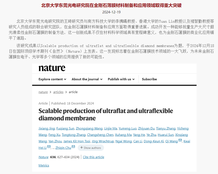 这一发现标志着在金刚石薄膜技术领域的一大飞跃,为未来金刚石薄膜在电子、光学等多个领域的应用提供了新的可能性。该研究成果于12月18日在国际顶级学术期刊《自然》(Nature)上发表。