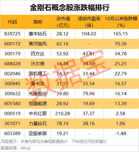行情方面,10月以来,惠丰钻石曾出现大幅上涨,区间最高涨幅一度超4倍,最新涨幅仍超165%。黄河旋风曾一度连续收获5个涨停板,10月至今累计涨幅超70%。四方达、沃尔德、国机精工等10月至今涨幅超20%。