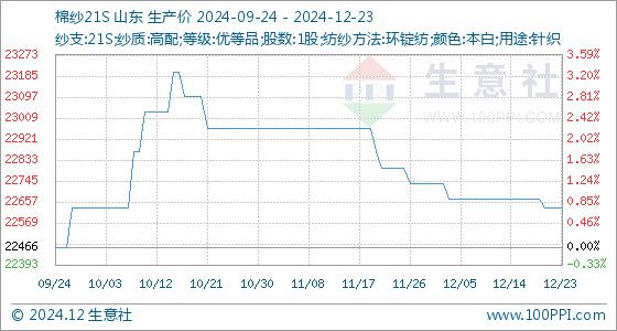 12月23日,生意社棉纱21S基准价为22633.33元/吨,与本月初(22733.33元/吨)相比,下降了-0.44%。