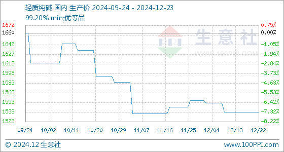 12月23日,生意社轻质纯碱基准价为1538.00元/吨,与本月初(1556.00元/吨)相比,下降了-1.16%。