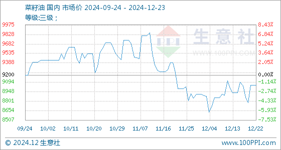 12月23日生意社菜籽油基准价为9041.67元/吨