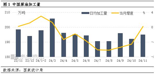 据国家统计局数据显示,11月份我国原油加工由降转增,11月份规上工业原油加工量5851万吨,同比增长0.2%,10月份为下降4.6%;日均加工195万吨,1-11月非农,规上工业原油加工量64910万吨,同比下降1.8%。