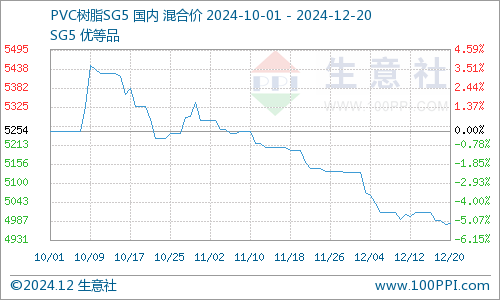 据生意社商品行情分析系统监测显示,本周(12.16-20)PVC现货市场延续上周跌势。截止周五,国内PVC电石法SG-5型均价4980元/吨,周内价格下跌0.64%。