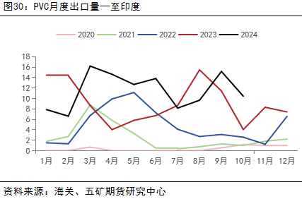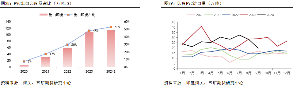 以出口细分项来看,我国出口印度占比国内总出口量逐年递增。2024年1-10月,我国出口至印度PVC总量115.2万吨,累积同比增长23%,占比国内总出口量53%。