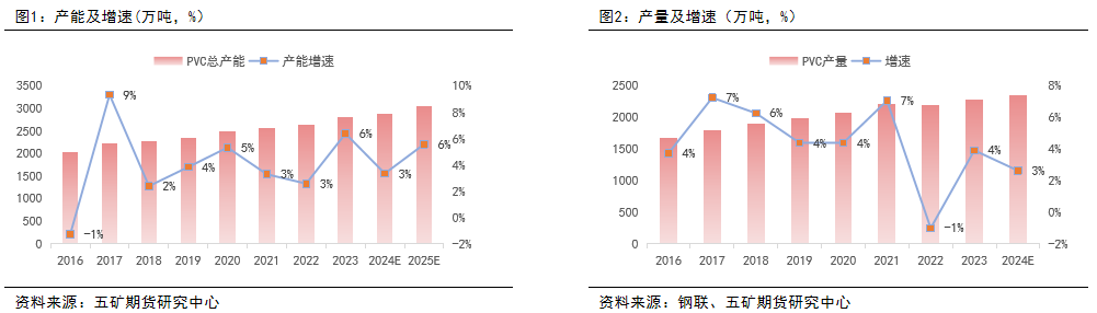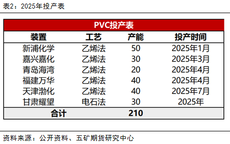 2024年,PVC全国产能3132万吨,投产90万吨,年产能增速3%,环比有所下降。新投产装置分别是宁波镇洋30万吨,金泰60万吨,而新浦化学以及甘肃耀望投产时间均有所推迟。2025年由于有前延期投产装置,预计有210万装置投产,若投产均能兑现,预计全年产能增速可达6%,投产压力有所增加。