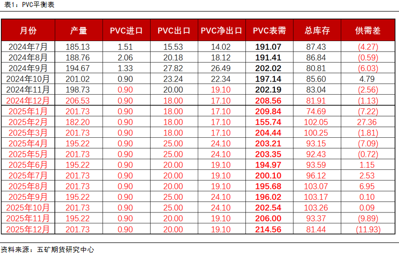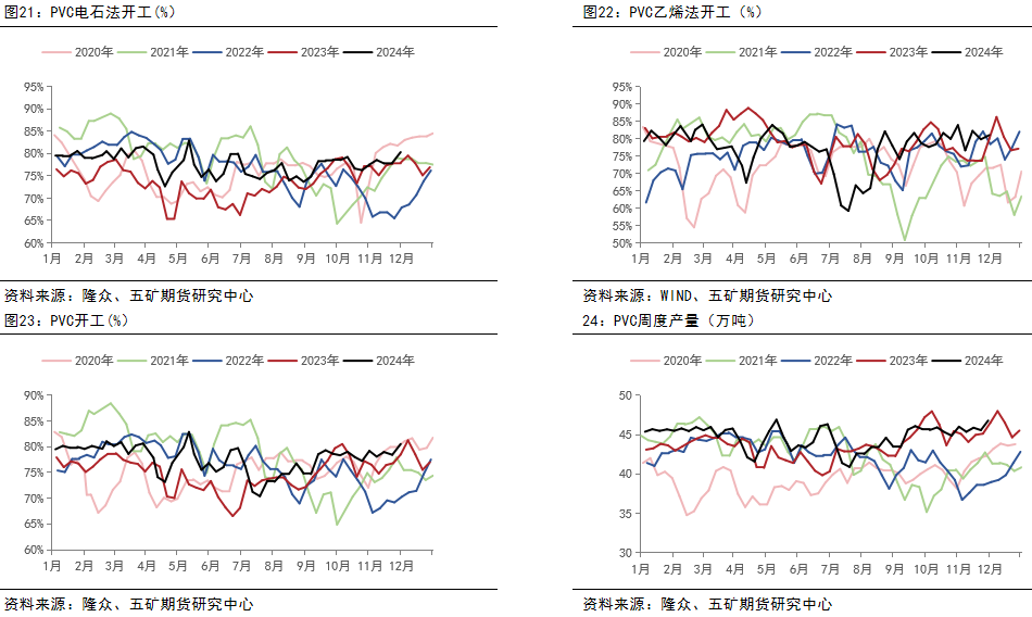 2024年回看:全年PVC价格在4900-6600之间震荡运行。1-4月,PVC价格中枢在5700-6100之间区间运行。年后,PVC大幅累库,价格承压下行,后PVC产业利润大幅亏损,市场预期春检力度有所增加,故而在利润低位下,盘面反弹。而在3-4月,春检计划陆续出台,检修力度弱于预期,PVC供应维持高位,使得盘面重新向下修正。直至4月下旬,国内地产政策频出,宏观情绪有所转暖,同时生产企业意外停车,使得PVC在产业利润深度亏损的位置,迎来一波低估值修复的上涨行情。以基本面看,彼时,行业库存仍处于高位,基差贴水主力合约,现实端羸弱。故盘面拉涨后,基差大幅走弱,5月底,回归基本面后,价格大幅回落。下半年,虽地产政策再度松绑,但大部分利多二手房交易,对于新开工拉动有限,PVC作为前竣工端商品,在社库库存难以去化的基本面背景下,绝对价格低位之下,继续震荡下行,寻求平衡。