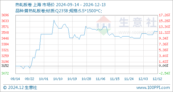 12月13日生意社热轧板卷基准价为3524.00元/吨