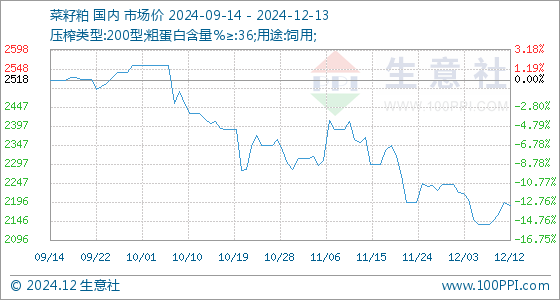 12月13日生意社菜籽粕基准价为2186.67元/吨