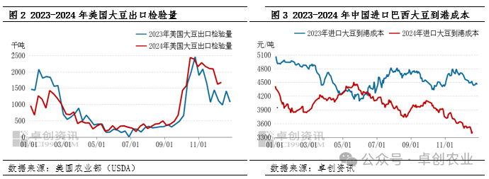 综上,美豆出口数据表现良好,全球豆油需求得到提振的前景下,给予CBOT大豆期价支撑,后期因美联储鹰派降息期价下跌;受到巴西汇率的贬值原因,出口销售步伐加快,带动中国到港成本走低,另一个角度来说也在提前释放明年南美上市后的供应压力,限制了后期出口价格的下跌空间。受到全球棕榈油市场维持偏强势头,预计豆油需求维持在较高水平,而在1月特朗普正式上台后,关于中美贸易的担忧或将对CBOT大豆期价的影响程度更高,而南美在明年初上市后也将带来供应的压力,因此预计本月CBOT期价在跌后维持企稳趋势,后期市场的利空影响可能还有进一步扩大。对于国内市场来说,由于到港成本走低,不利于支撑国产现货价格,带给现货市场利空影响。
