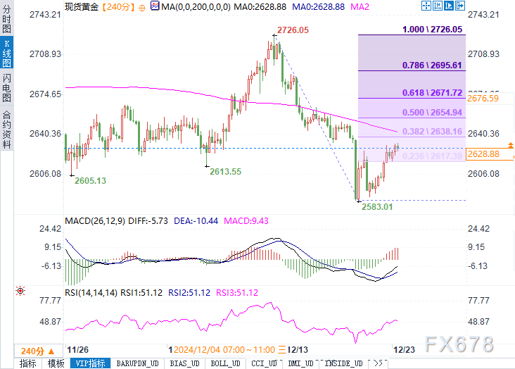 从技术面来看,黄金的反弹动力虽然有所增强,但整体走势依然受到制约。金价近期突破了23.6%斐波那契回撤位,呈现出一定的上涨动能,但日线图和4小时图上的负面震荡指标提醒投资者,进一步上涨可能面临较大的阻力。因此,投资者应谨慎操作,等待更强劲的跟进买盘信号再做进一步决策。