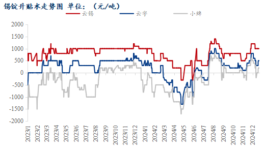 今日套盘商对沪锡2501合约套盘云锡升水1000元/吨左右,普通云字升水500元/吨左右;小牌升水200-300元/吨,进口锡贴水700元/吨左右。
