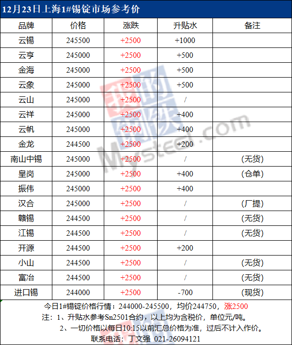 12月23日Mysteel上海现货锡锭报价244000-245500元/吨,均价244750元/吨,较上一交易日涨2500元/吨,Mysteel15:30上海现货锡锭成交价格243500-245000元/吨,均价244250元/吨,较上一交易日涨2500元/吨。