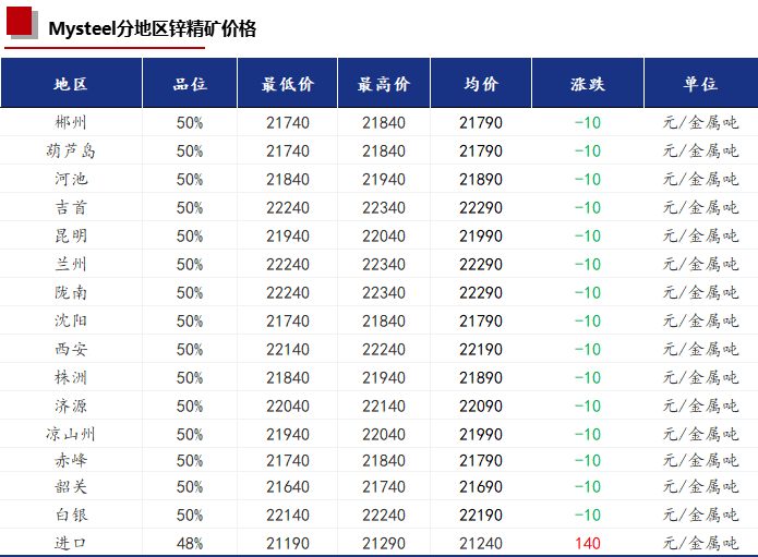 今日国内锌精矿加工费整体持稳,各地区均未调整。受锌价的影响,锌精矿价格下跌10元/金属吨。进口TC主流报价-45至-25美元/干吨,今日暂无调整。