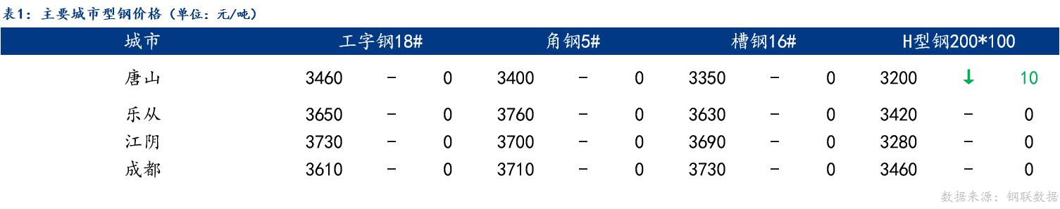 今日主流市场型材价格稳中趋弱调整,唐山、乐从、江阴、成都市场型材主流持稳,唐山H型钢价格下跌10元/吨。