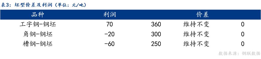 从坯材价差来看,工字钢、角钢、槽钢与钢坯价差维持不变。