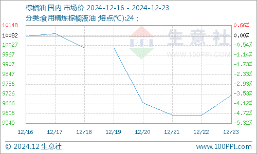 据生意社商品行情分析系统显示:12月中旬开始,多空因素叠加,棕榈油现货行情跳水过后迎来反弹,12月23日单日上涨超1%,反弹幅度不及跌幅,整体依旧下行为主。12月16日,棕榈油市场均价10082元/吨,12月23日,棕榈油市场均价9720元/吨,价格下跌3.59%。