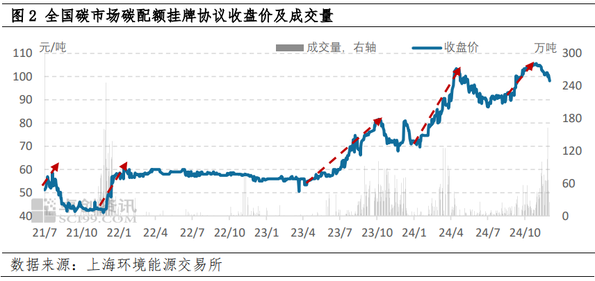 第四轮:2024年,对于碳市场扩围的消息充斥着市场,临近“十四五”收官,碳市场的扩围的需求也更加紧迫,对于扩围纳入几个新行业、纳入哪个新行业都有不确定性,同时也叠加CCER交易的重启,碳价开始了一波明显的上涨,一度突破了100元/吨的高位。随后有一轮小幅度的回调。
