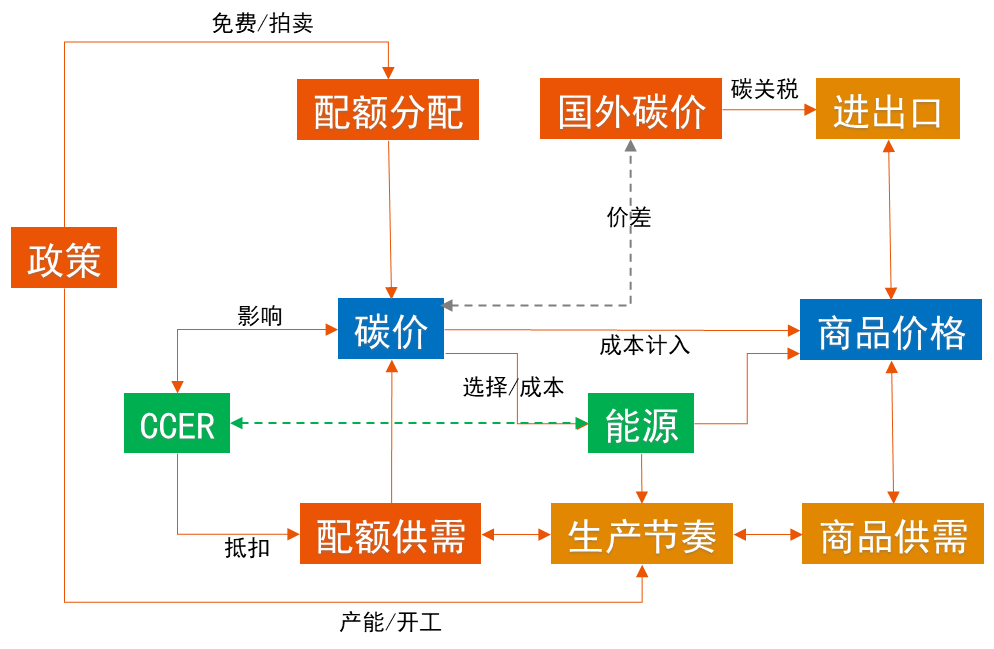 碳市场的建设运行,会对重点排放行业的产品的生产、消费、成本、价格、出口等产生直接影响,同时也将通过碳足迹、碳关税等方式影响非重点排放行业的商品。