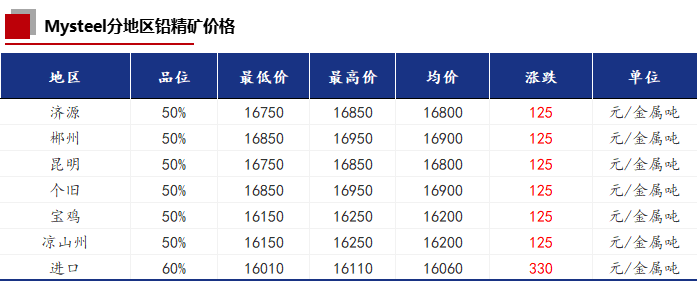 今日受铅锭价格影响,铅精矿价格较上一交易日上涨125元/金属吨。铅精矿加工费各地区均未调整,较上一交易日持平。进口铅精矿价格较上一交易日涨330元/金属吨。