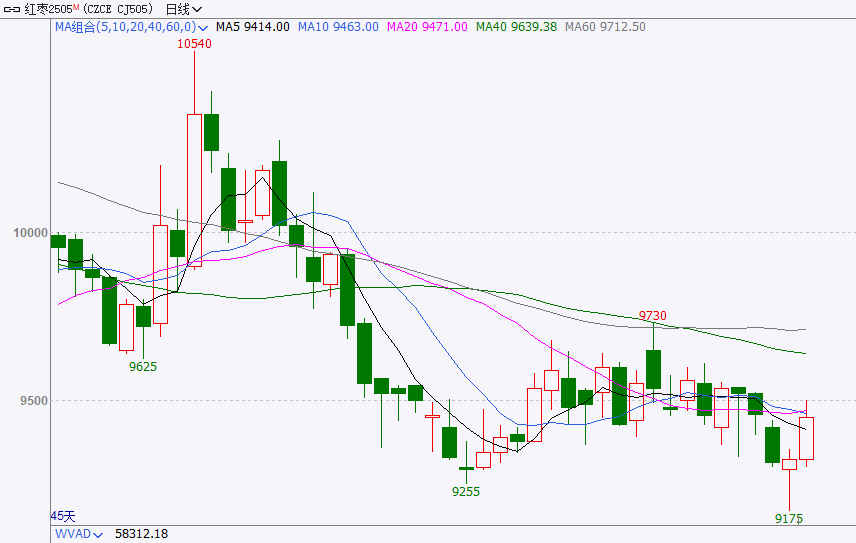 因利空兑现,产区货源紧张,市场去库加快等因素影响,今日红枣主力2505合约走出触底反弹行情,截止下午收盘报9450元/吨,日涨190元/吨,涨幅2.05%。