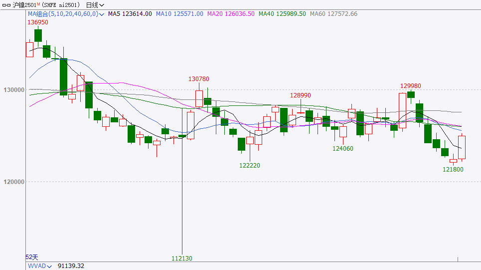 12月23日沪镍主力2501合约盘中低位反弹,截止下午收盘报124960,涨幅2.11%。