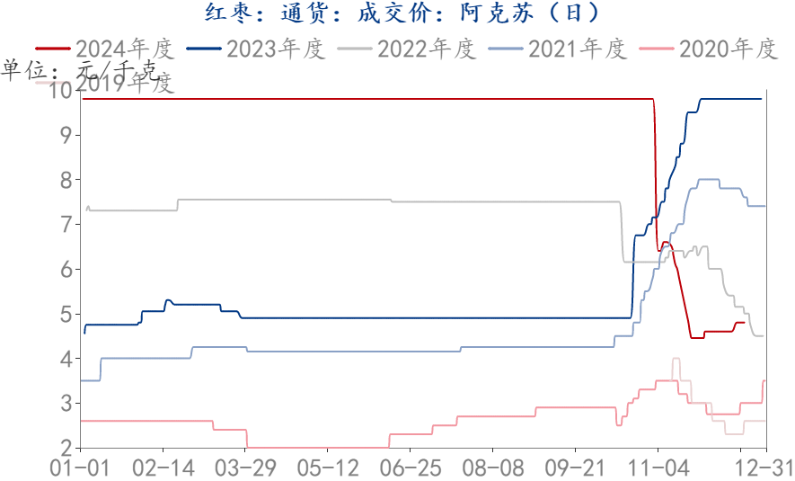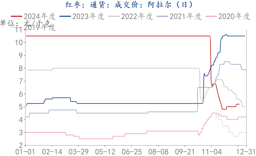 1.利空兑现,市场触底反弹。新年度红枣增产预期落地,新疆主产区灰枣销售已进入尾声,目前仅剩少量零星未售货源在卖,但报价较为坚挺。阿克苏地区红枣主流成交价格参考4-5.5元/公斤,部分一般货成交价格略低;阿拉尔地区灰枣采购货源质量参差不齐,主流成交价格参考4.8-5.6元/公斤;喀什地区质量不错的货价格在5.5-6.5元/公斤,麦盖提地区主流成交价格在5-6元/公斤。
