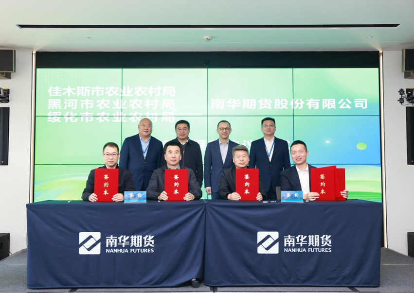 在随后的签约仪式中,南华期货总经理贾晓龙与黑龙江省黑河市、佳木斯市、绥化市三个地级市农业局负责人签署了战略合作协议。李文德副厅长、南华期货董事长罗旭峰、南华期货党委委员、总经理助理刘群、南华期货董事总经理唐启军等领导出席了签约仪式,共同见证了这一重要时刻。