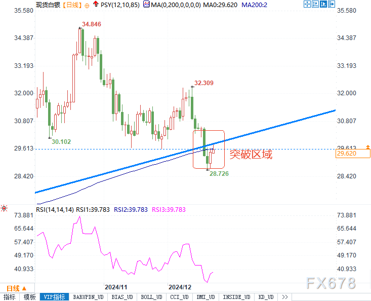 12月23日周一盘中,截至目前白银价格反弹,测试日线图上从2月29日低点22.30美元绘制的上升趋势线的突破位置,接近30.00美元。白银价格在200日均线(EMA)附近波动,表明长期走势尚不明朗;