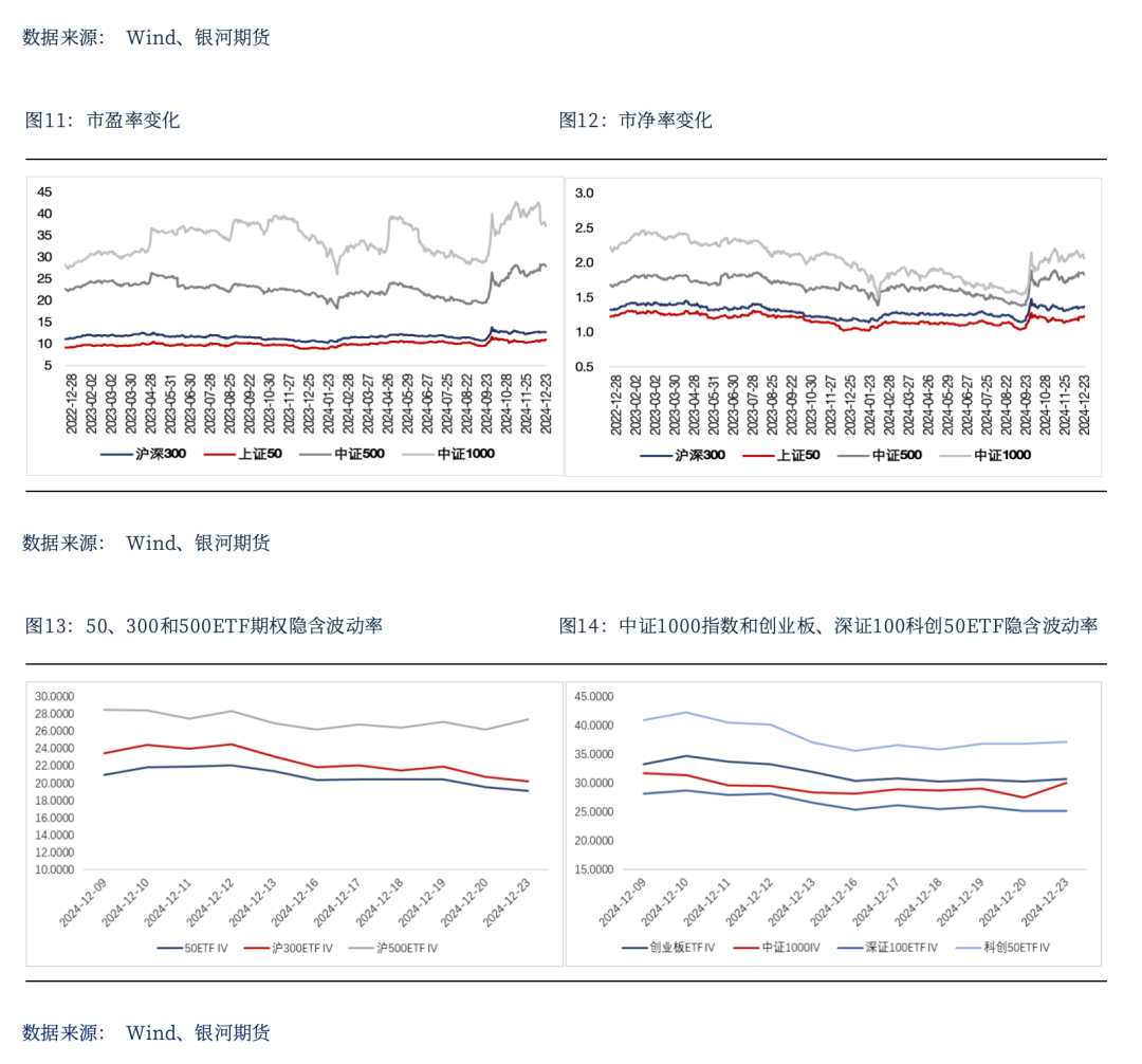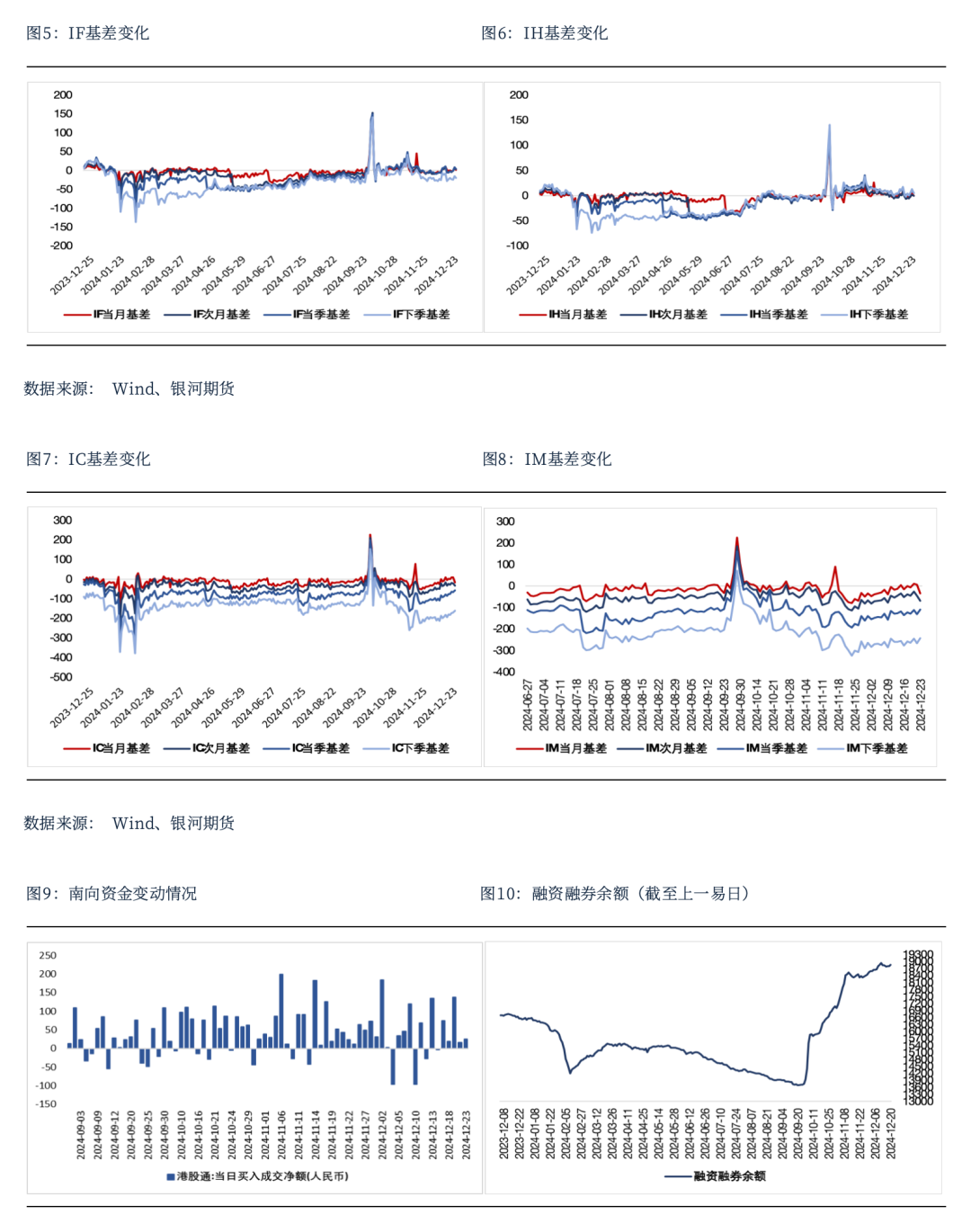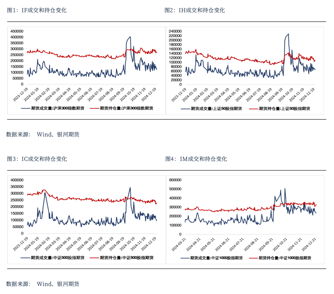 股指期货随现货分化,至收盘,主力合约IH2501涨0.84%,IF2501涨0.09%,IC2501跌1.66%,IM2501跌2.58%。合约转换手基差整体收敛。IC、IF、IH和IM成交分别下降13.6%、16%、8.8%和6.2%,持仓分别增加3.6%、3.2%、5.4%和7.4%。