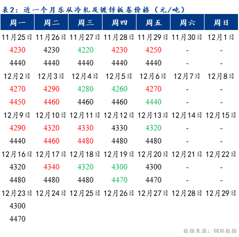 截止2024年12月23日17:30,冷轧板卷月均价为4286元/吨,镀锌板卷月均价为4460元/吨。