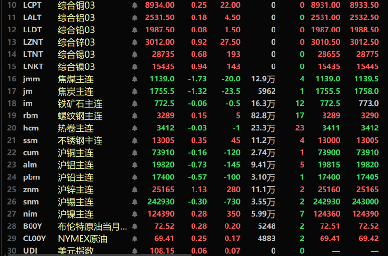 黑色系多飘绿,铁矿、热卷微跌,螺纹涨0.15%。不锈钢涨0.35%。双焦方面,焦煤跌1.73%,焦炭跌1.32%。
