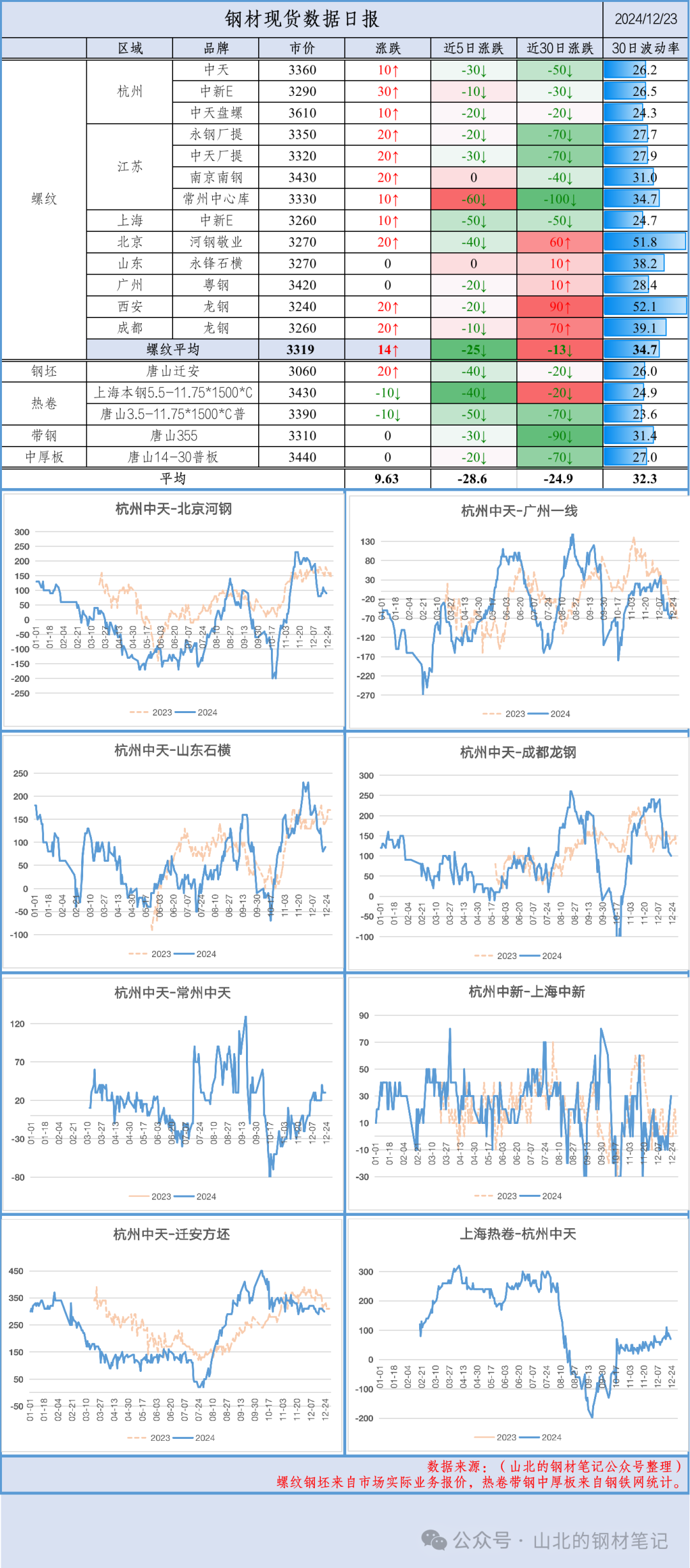 2024年12月23日,杭州晴,中天普通螺纹价格3360元/吨,中天盘螺价格3600元/吨,周末杭州螺纹库存43.9万吨,螺纹出库8.2万吨。阳历同比去年库存47.6万吨,去年出库3.0万吨。(普通螺纹指导价3360,盘螺3600)。