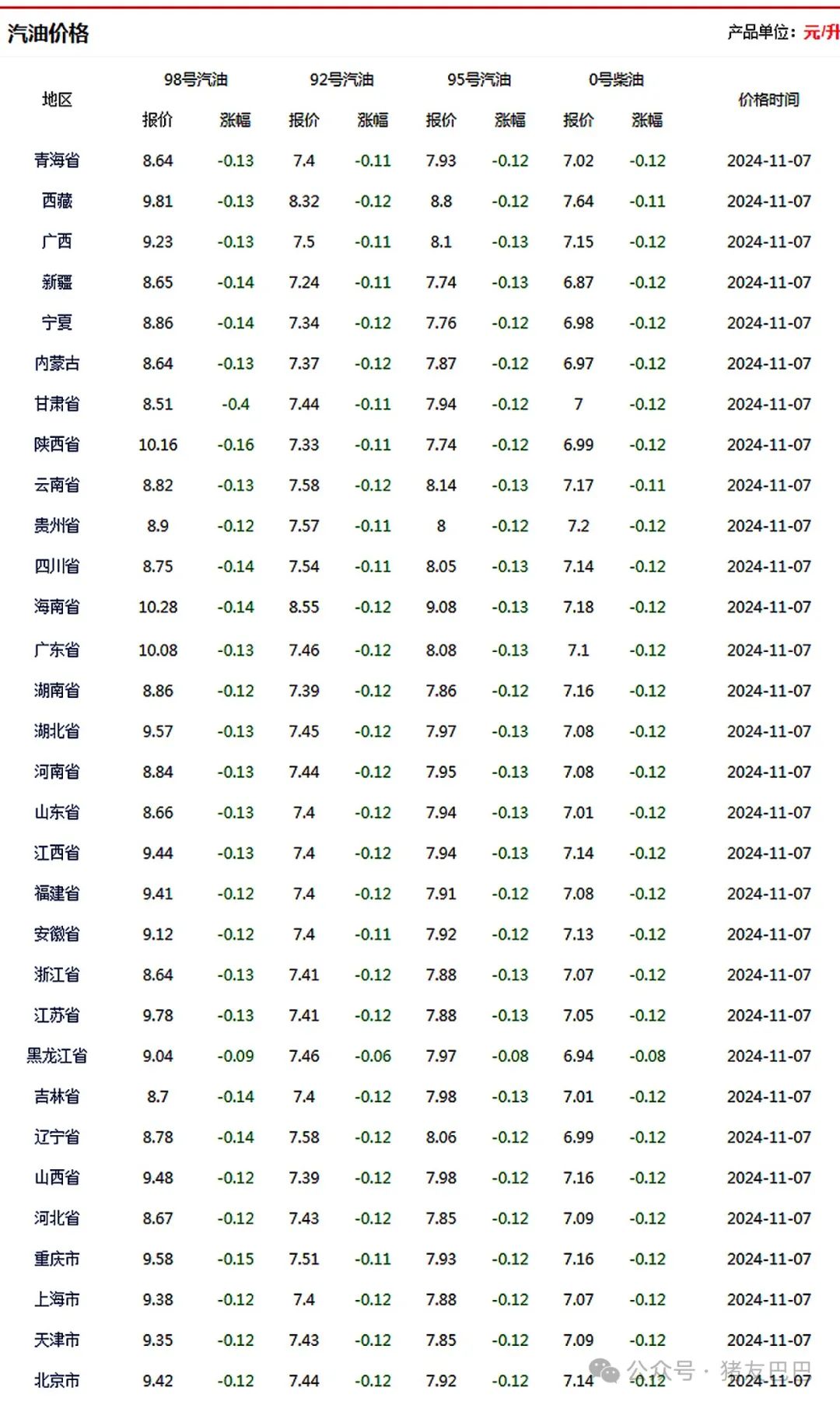 3、全国各成品油号调价日一致,均为当天24时进行调整;