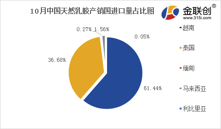 11月,本月进口乳胶最多的国家仍为越南,占总进口量的61.44%左右,细分看来:自越南进口量上涨至2.29万吨左右,环比上涨8.54%,占总进口量的61.44%;自泰国进口量至1.37万吨左右,环比上涨33.84%,占总进口量的36.68%;自缅甸进口量回落至0.01万吨附近,环比宽幅下跌42.75%,占总进口量的0.27%;自马来西亚进口量小幅下降约0.06万吨,环比下跌3.54%,占总进口量的1.56%;本月新增进口国利比里亚,进口量占比约0.05%。