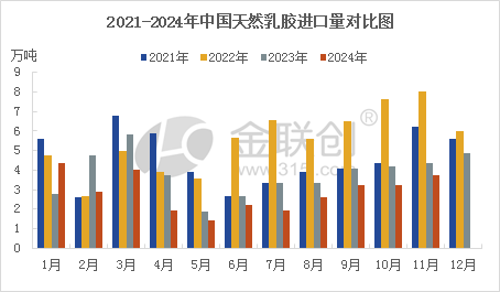 据海关公布的数据显示,2024年11月,中国天然乳胶进口量共计3.73万吨,环比上涨16.14,同比下降14.79%。2024年1-11月,中国天然乳胶进口量共计31.44万吨,同比下跌23.19%。